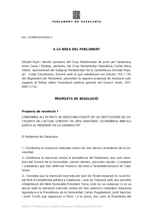 Alhora, en una proposta conjunta amb JxCat i la CUP, condemnen aquest “intent de desestabilització de les institucions de Catalunya” en l’actual context de crisi sanitària i econòmica, defensen que el president Torra no ha comès cap delicte i reiteren la seva solidaritat. Recorden, també, que "només la majoria del Parlament té legitimitat per atorgar o retirar la confiança a la presidència i al Govern de la Generalitat".