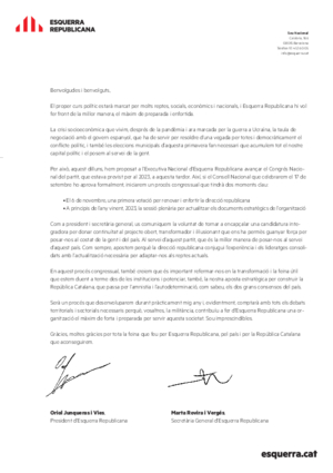 Així ho han comunicat a la militància republicana el president i la secretària general d’Esquerra, Oriol Junqueras i Marta Rovira, en una carta on mostren la seva voluntat, energia i compromís de tornar-se a presentar per seguir liderant l’organització i destaquen la importància que la militància hi participi i contribueixi a “fer d’Esquerra Republicana una organització encara més forta i preparada per servir aquest país”.