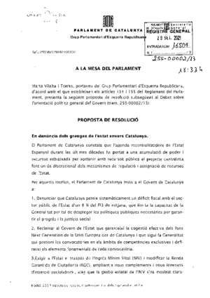 Per marcar l’acció del Govern, Esquerra Republicana ha presentat un seguit de propostes de resolució, tan individualment com conjuntament amb Junts per Catalunya. Entre les propostes hi ha la de promoure un front comú per defensar la llengua i reforçar el sistema audiovisual català; exigir a l’estat espanyol el traspàs de la Prefectura Superior de Policia de la Via Laietana per convertir-la en la seu del Memorial Democràtic, un centre d’interpretació de la memòria per denunciar la impunitat i la tortura durant el franquisme i la Transició; i garantir que la interrupció voluntària de l’embaràs es pugui dur a terme als hospitals del sistema públic de cada regió sanitària.