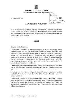 Per tot plegat, la moció també planteja instar el Govern de la Generalitat a no només vetllar pels drets i llibertats de la ciutadania sinó també a emprendre accions legals davant d'aquestes intervencions i exigir al govern espanyol modificar la llei franquista sobre secrets oficials (9/1968) per tal que sigui democràtica i reguli el control extern i independent del CNI.
