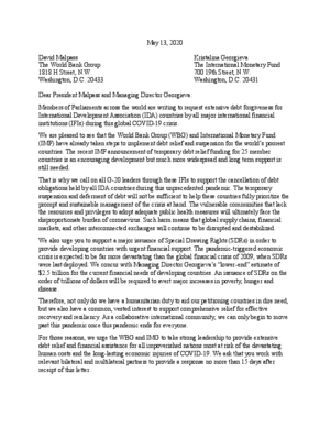 La iniciativa, impulsada pel senador demòcrata nordamericà Bernie Sanders i la congressista nordamericana, també demòcrata, Ilhan Omar, pretén que els països amb més necessitat puguin prioritzar les despeses destinades a combatre el coronavirus. D’aquesta manera es donaria resposta a la creixent preocupació per als països en vies de desenvolupament i les economies emergents, que es preveu que quedaran devastats arrel de la pandèmia.