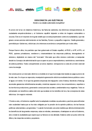 Al text, alerten que el preu de la llum ha assolit màxims històrics, les elèctriques s’enriqueixen, la ciutadania s’empobreix i, mentrestant, “el govern espanyol deixa milers de llars vulnerables a les fosques”. Així resumeixen la “gran estafa” que s’està perpetrant contra la ciutadania, pimes i petits negocis. Una estafa “generada i permesa pel PP i pel PSOE”, afirmen, “perquè van ser ells els qui van privatitzar, vendre i desmantellar les empreses públiques, van desregular el sistema i el van deixar en mans del ‘mercat’, un mercat que ells mateixos controlen i manipulen des dels consells d’administració que ocupen no pocs expresidents i exministres”, recorden.