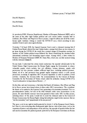 El president dels republicans ha fet arribar, junts amb les missives, la carta que l’eurodiputada Diana Riba ha fet arribar a la Comissió Europea i a l’ONU sobre l’amenaça del Tribunal Suprem als funcionaris de les presons catalanes.